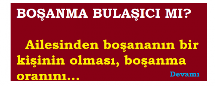 Amerika’daki Brown Üniversitesi’nde 32 yıl boyunca ‘boşanma’ konulu araştırmayı psikolog Rose McDermott, yakın bir arkadaşı veya akrabası boşanan çiftlerin ayrılma ihtimallerinin yüzde (%) 75 arttığını açıkladı.