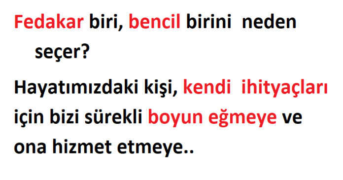Hayatımızdaki kişi, kendi bencil ihityaçları için bizi sürekli boyun eğmeye ve ona hizmet etmeye zorlar. Öyle bir system kurmuştur ki, istediği olmadığında adeta 3 yaşındaki çocuk gibi küser, darılır, eleştirir, azarlar , yok sayar, surat asar..