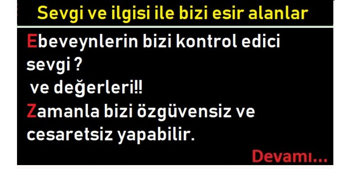 İşte ebeveynlerin bizi kontrol edici sevgi ? ve değerleri!! Zamanla bizi özgüvensiz ve cesaretsiz yapabilir. İlerleyen dönemlerde ise hayatımızda aldığımız (ebeveyne benzeyen ) kişiler de aynısını bize hissettirir. Ne zaman girişimde bulunsak, onlar ya hastalanır ya depresyona girer ya da ağır suçlamalar ile vicdanımızı baskı altına alırlar.