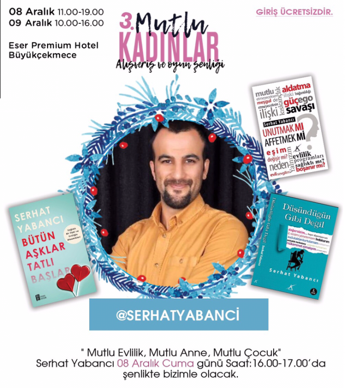 ETKİNLİKLER Söyleşi-Mutlu evlilik Mutlu anne mutlu çocuk By Serhat Yabancı - 5 Aralık 2017 0 1376 Facebook Twitter Google+ Pinterest WhatsApp Söyleşi-Mutlu evlilik Mutlu anne mutlu çocuk Serhat Yabancı 8 Aralık cuma saat 16:30 da , Büyükçekmece Eser premium Hotelde söyleşi yapacaktır. Katılım ücretsiz, söyleşi sonrası kitap imzası yapılacaktır. Facebook Twitter Google+ Pinterest LinkedIn